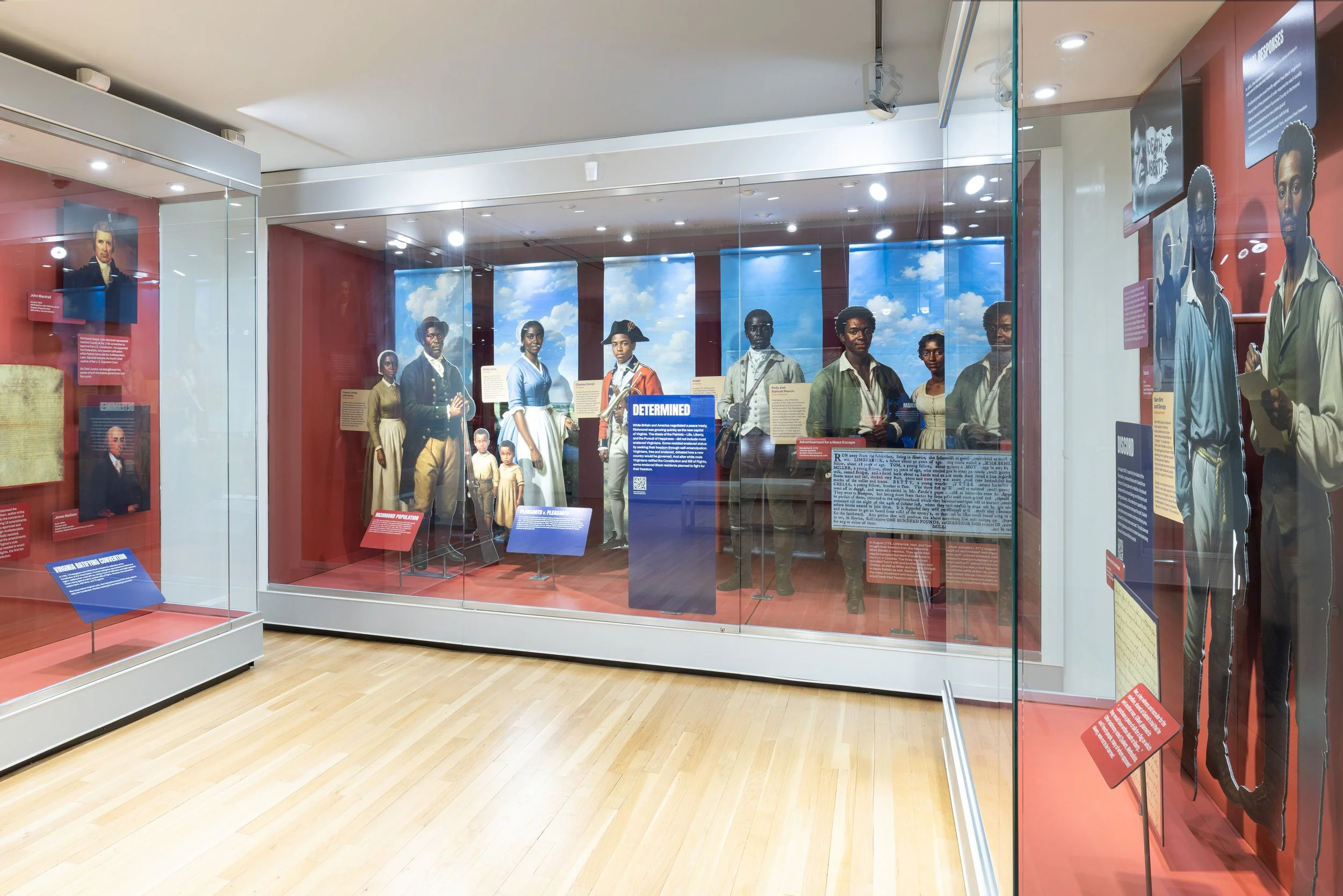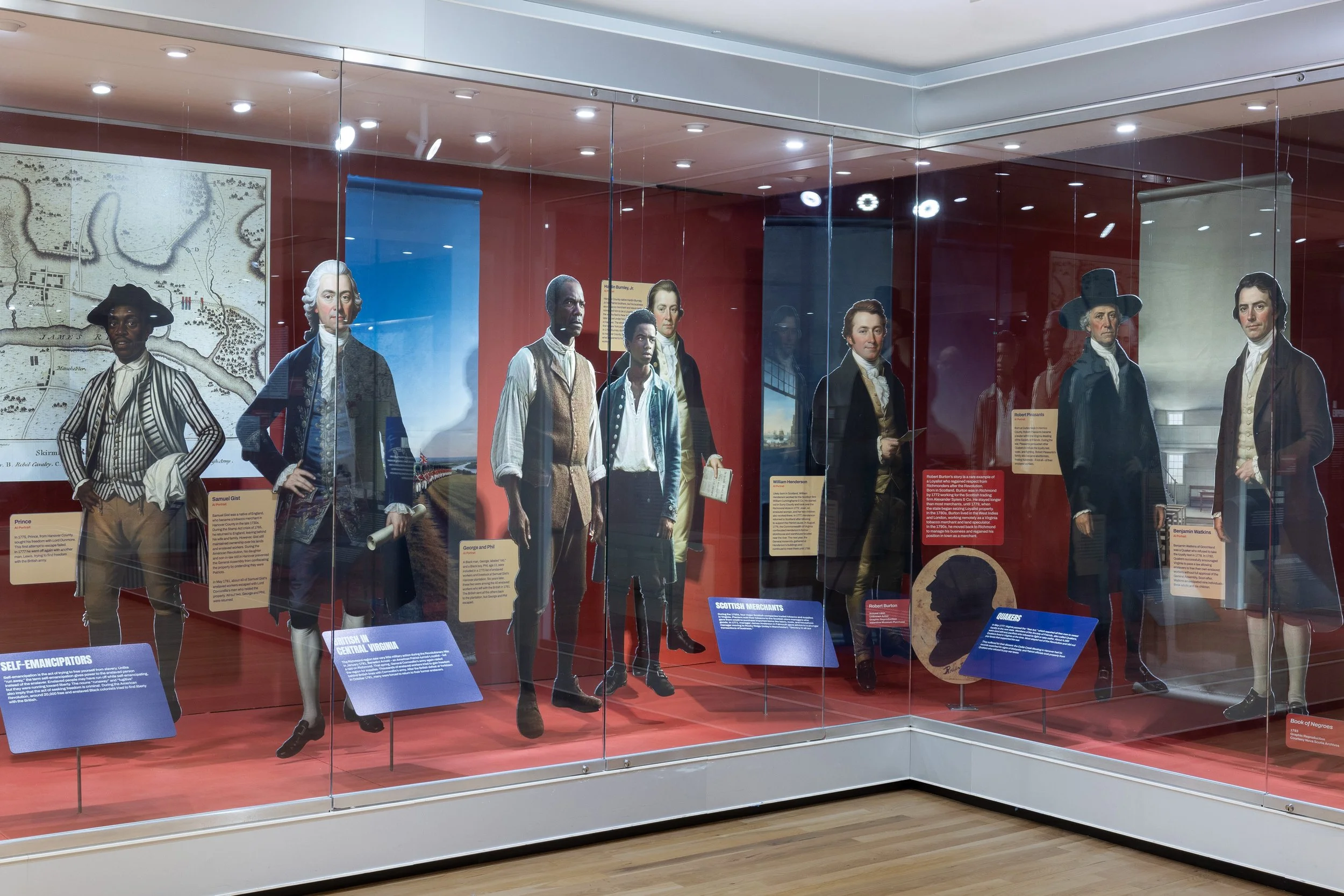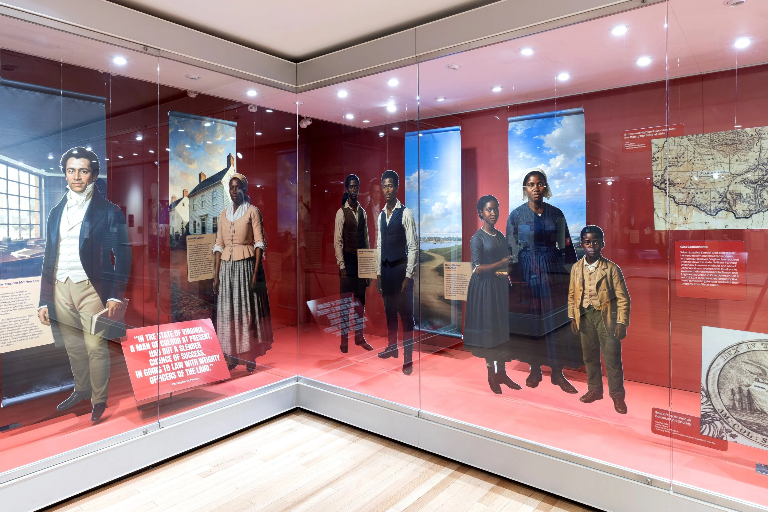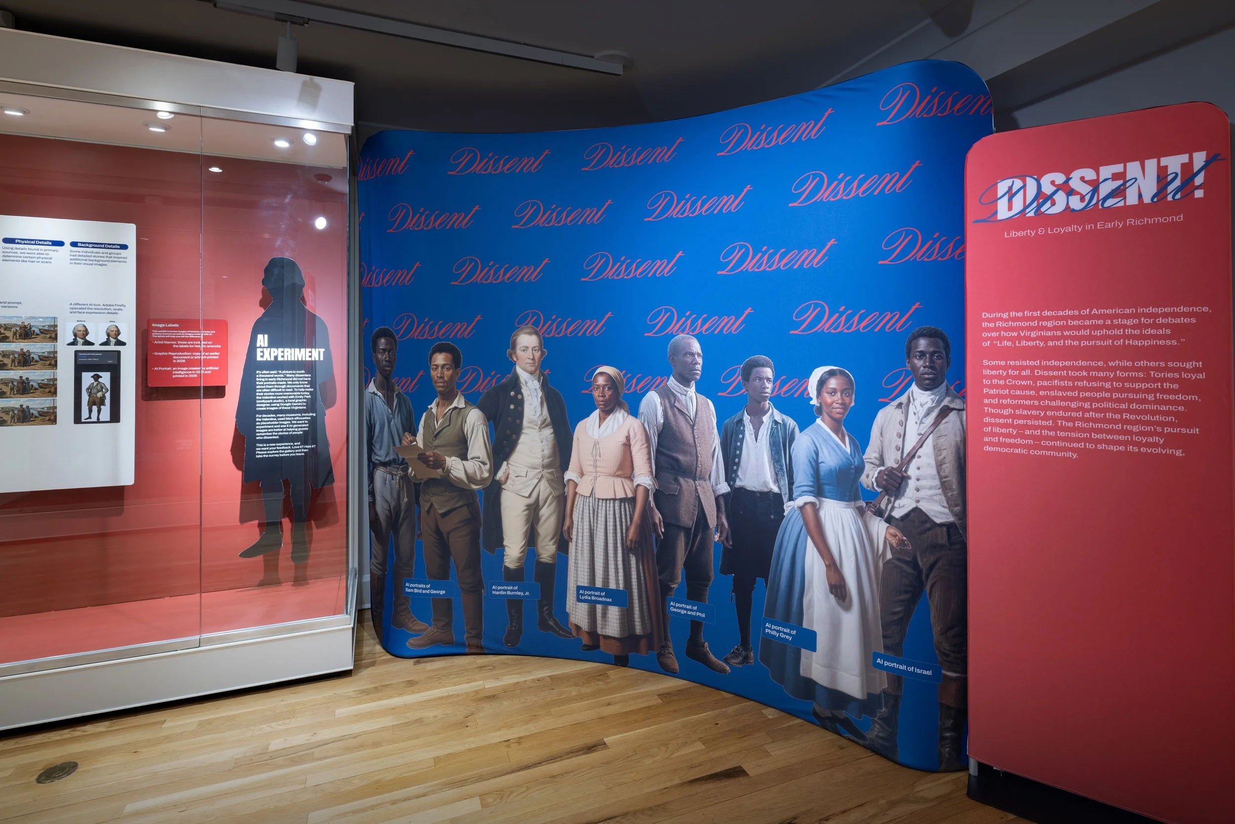 For Dissent! Liberty & Loyalty in Early Richmond at The Valentine, I was involved from concept through production — building the art direction framework and navigating one of the exhibition's most deliberate decisions: how to use AI meaningfully without letting it overshadow the work. The technology served a specific purpose: recovering visual presence for 30 Virginians from the 1770s–1830s whose likenesses were never recorded — people who dissented, stood for their values, and were erased from the historical record. The design challenge was to keep their individual stories at the center, using AI as a quiet instrument rather than a spectacle.